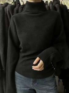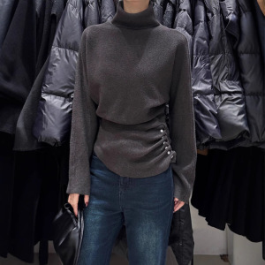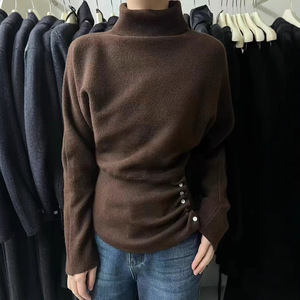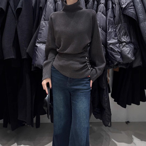 高襟のサイドフリルのデザイン感のあるニットの女性2024秋冬の中に腰を収めてやせた雰囲気の上着を見せます。