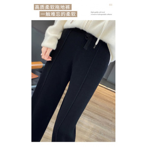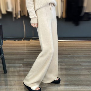 目を閉じて! ワイドパンツの女性はゆったりとしていて、カジュアルな外は垂れ下がった感じのズボンを着ています。