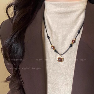 虎眼石編み革紐ネックレス女性秋冬2024新型起爆セーターチェーン復古風気質百合アクセサリー