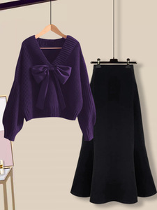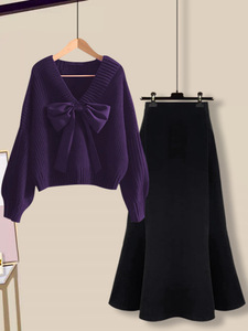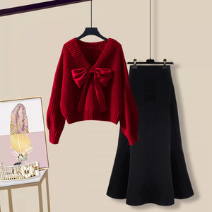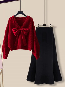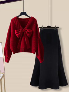 アンコラの赤い蝶結びのニットのセーターのスーツの女性の秋冬の高級感は肉を遮って見えます。