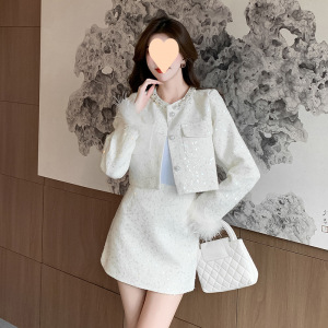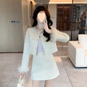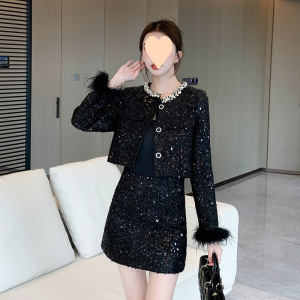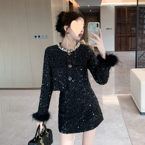 重工軽豪華スパンコール小香風セット高級感名媛コート高腰半身スカート2点セット
