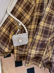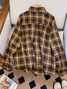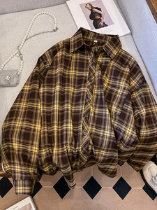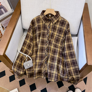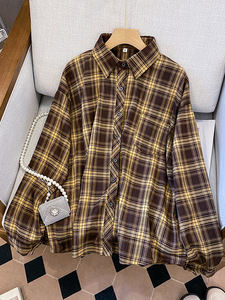 美ラードのレトロなカレーの格子縞のシャツの春秋の新型の長袖の百合のカジュアルなカーディガンの格子のシャツの女性の上着
