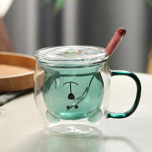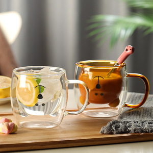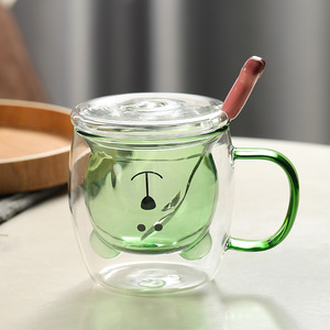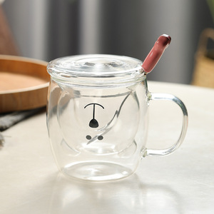耐熱二重シリコンガラス製クマ型カップ、蓋、ハンドル、スプーン付き、動物型ミルクティー用耐熱ガラスカップ