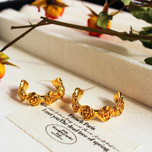 花開富貴新年金真鍮メッキ真金立体彫刻バラC形耳輪軽贅沢金色イヤリング460