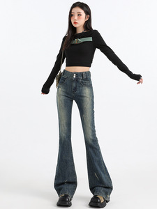 ハイウエストフレアデニムパンツ レディース マイクロフレア 秋の人気商品 2025年新作 スリムフィット オイルカラー ヴィンテージ風 ロングパンツ トレンド インス