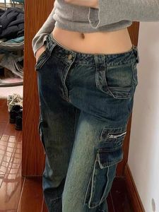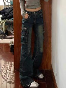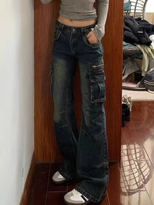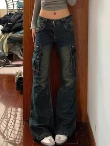 レトロなローウエストポケット付きワークウェア風マイクロフレアパンツ レディース 2025年春秋新作 ホットガールデザインデニムパンツ
