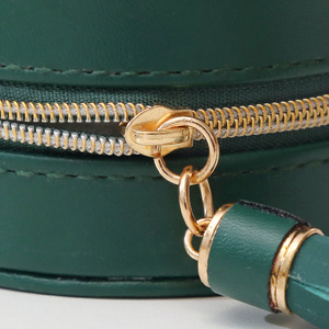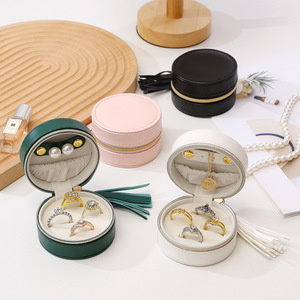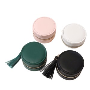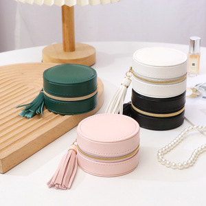 PUレザー製丸型タッセル付きジッパー式指輪・イヤリング・ネックレス用ジュエリーボックス、携帯用ミニ収納リングケース