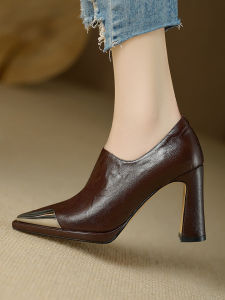 絶子よ疲れない足の深い口の靴の女性の2024新型の金属の先の気質の防水台のハイヒールの英倫