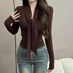 2024秋冬服独特のシックなタイツの上着の大衆デザイン感のある純色の長袖の中にtシャツの女性がいます。