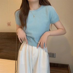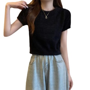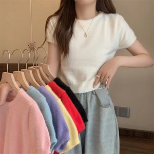 丸襟の頭の純色の半袖のニットの女性の春の韓国版の短い金は純色を修理してミンクの上着の女性の小さいシャツの潮をまねます。