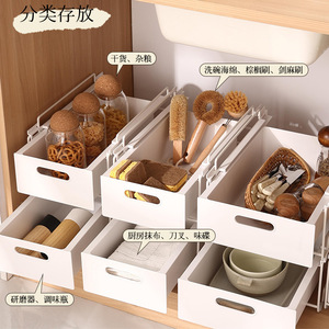 台所の食器棚の収納ケースを引き出して、重ねて棚を置くことができます。