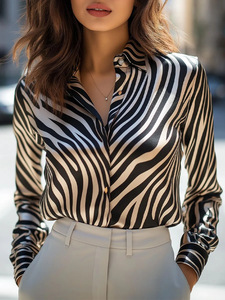 2025 クロスボーダー新 M 高弾性サテンプリントヒョウ柄春秋カジュアルルーズシャツヨーロッパとアメリカの女性のボタントップ