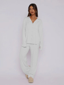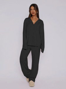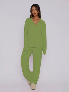T112国境を越えた欧米の女性の春秋家庭の快適な長袖の襟の単列のボタンの上着のストレートなズボンのスーツ