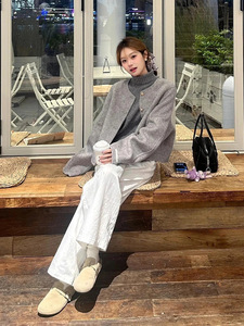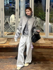 グレーの短い毛は、女性の秋冬の高級感が小さい背の高い襟のセーターの白いワイドパンツの3点セットです。