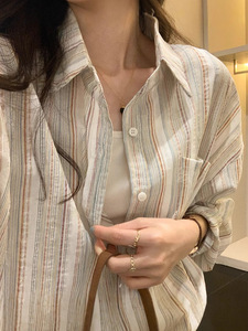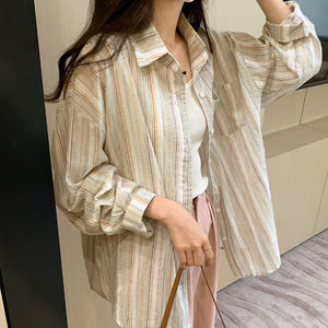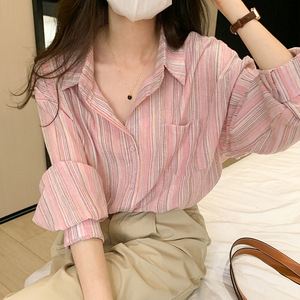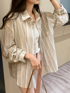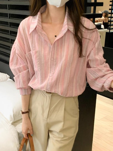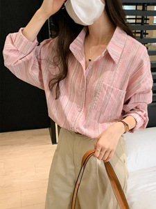 アメリカのレトロなピンクの長袖のストライプのシャツの女性の春と秋の日焼け止めのコート