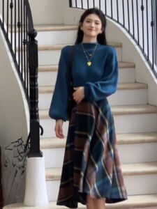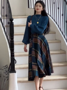 【セット】秋冬フレンチ高級小香風レトロニットセーターハイウエスト軽豪華チェックスカート1118 Q18