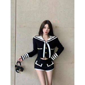 アメリカンカレッジ風スーツ 女性用 ネイビーカラー ショート丈ニットカーディガントップス 春秋カジュアルショートパンツ ツーピースセット