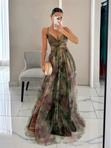 クロスボーダー 2025 ヨーロッパとアメリカの春夏の新スタイルメッシュプリントサスペンダードレス INS バケーションカジュアルパーティードレス