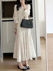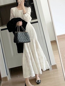 2025春秋服新型名媛茶休フレンチワンピース高級感白シフォン刺繍魚尾ロングスカート