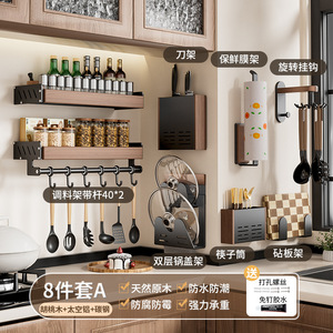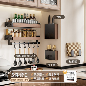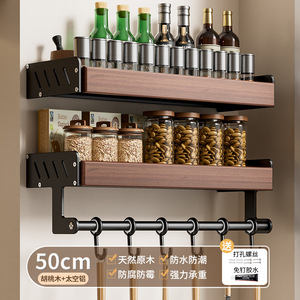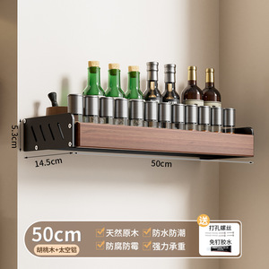 胡桃の木の台所の物置棚の中古風は穴を開けないで多層の実木の鍋の蓋の刀の箸のスプーンの調味料の壁掛けの収納棚を作ります。