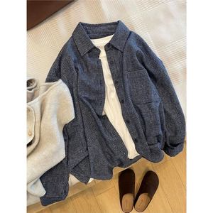 青い格子が毛を磨いていますね。シャツのコートの女性2025春秋の怠惰な風のたるみ感がゆるい長袖シャツ