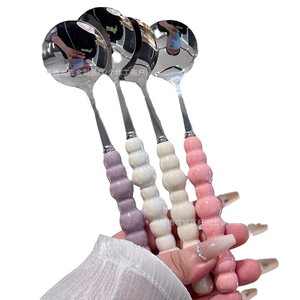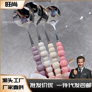 创意不锈钢勺子可爱四色珍珠手柄高颜值少女心圆勺家用甜品勺