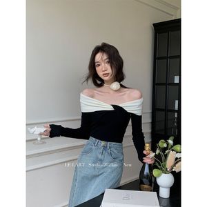 秋冬の新型韓国版のデザイン感は色にぶつかってやせているニットの小さい大衆の純粋な欲の優雅な1字の肩の上着の女性にぶつかります。