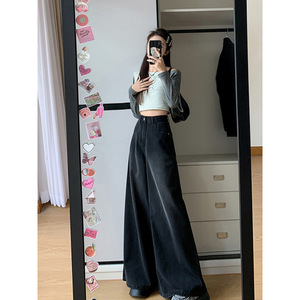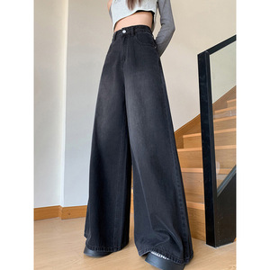 黒灰色のゆったりとしたジーンズの女性は秋に腰が高くて痩せています。