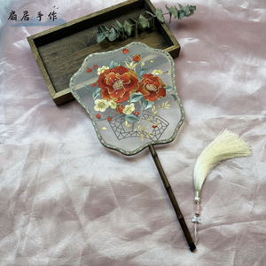 扇居手作十二花神シリーズ窓間茶花片面異型刺繍団扇紫竹短柄古風扇子