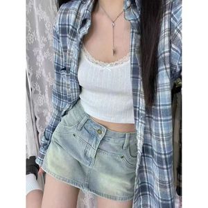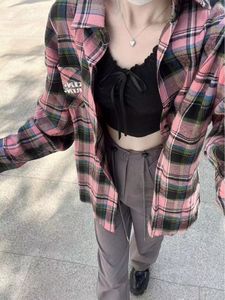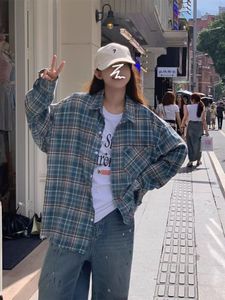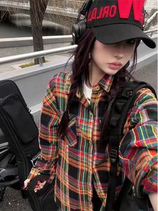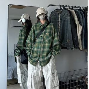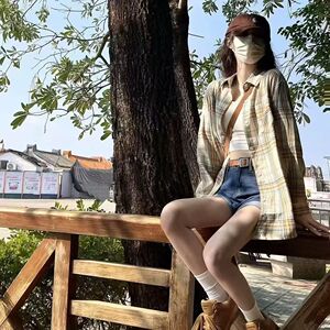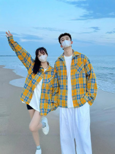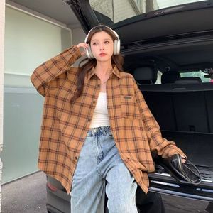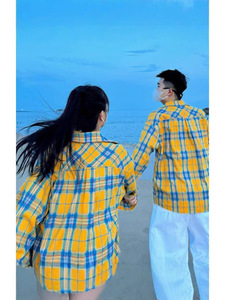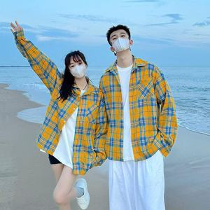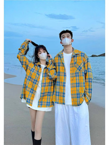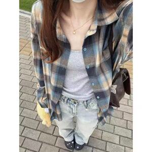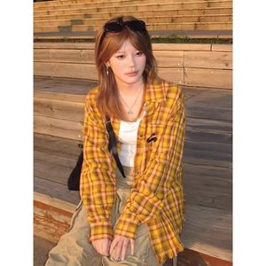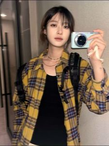 アメリカのレトロな黄色の格子のシャツの女性の春と秋の長袖のシャツのゆったりしているカップルのカジュアルな上着のコートのデザイン感