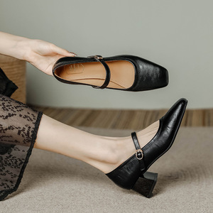 フレンチレザーレトロシューズ女性用2025新作太ヒールスクエアトゥワンラインバックルメリージェーン多用途ミッドヒールイブニングシューズ