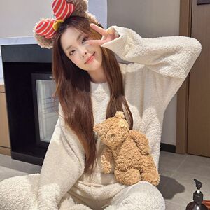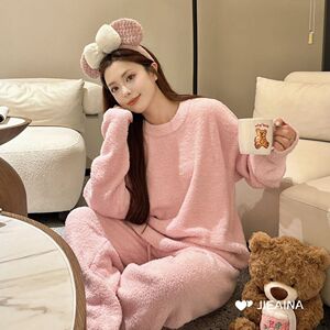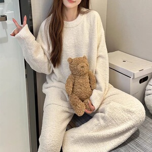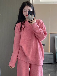 Ins韓国版カジュアル純色半端毛パジャマ女性冬の新型厚手保温ニットズボンホームセット