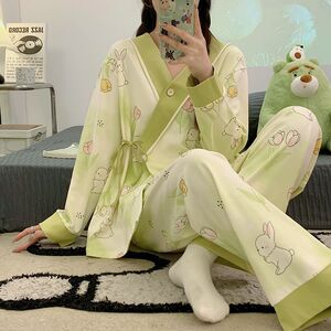 【胸パッド付きVネック純綿】867#胸パッド付きグリーンウサギ