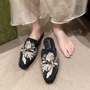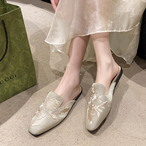 スエード素材のスクエアトゥ、つま先が覆われた、女性用春夏新作、上品な花柄、スカートに合う、小さめの香り漂うスタイルのスリッポンシューズ