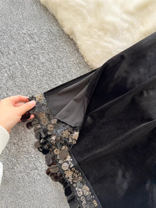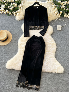外国貿易の気質の金のベルベットのスーツの女性の高級感のスパンコールの上着の高腰のオープンフォークのスカートのスーツの0415