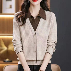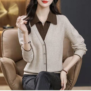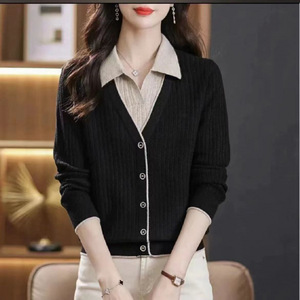 韓国版の長袖のセーターの女性の2024春秋の新型の百合のゆったりしている襟の偽の2つは長袖をつなぎ合わせます。