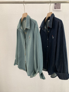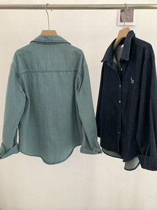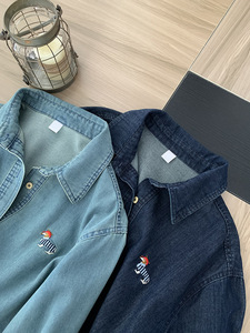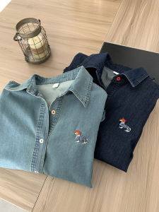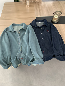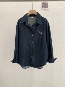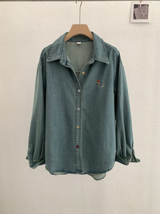 Omalai 刺繍入り子犬カラフルなシングルブレストラペル長袖ミドル丈デニムシャツトップス春 1970