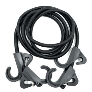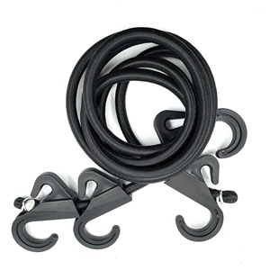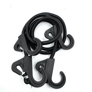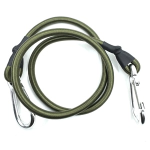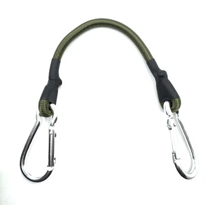 アウトドアの荷物の紐を縛って、ゴムを持っています。