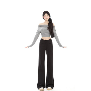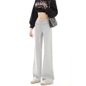 春秋用 ロング丈 グレー エアレイヤー ローウエスト マイクロフレア スポーツパンツ レディース ストレート 細見え カジュアル スウェットパンツ