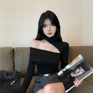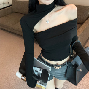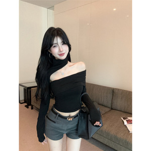 心機設計非対称風の短い上着のtシャツの肩の黒い透かし彫りの修身感は臍のギャルを現してやせて首を掛けます。