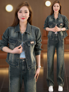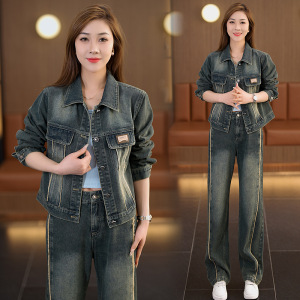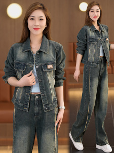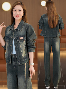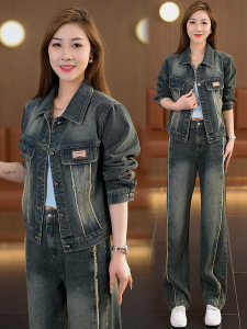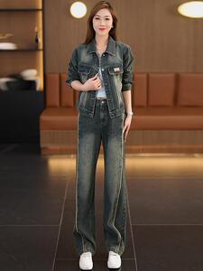 ファッションのレトロなデニムのスーツの女性の2025春秋の新型の洋気はやせているオーバーの広腿のズボンのカジュアルな2つのセットの潮を現します。