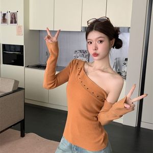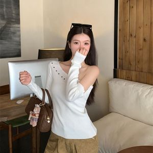 早秋の新型ギャルのアイロン掛けの斜め肩の修身の下着の上着のアメリカ式の設計の長袖の独特なtシャツの女性