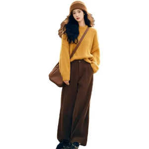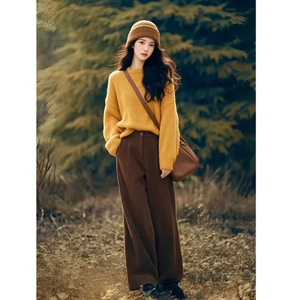 2025春秋新款韩版时尚气质黄色针织衫女装高级毛衣小众阔腿裤套装