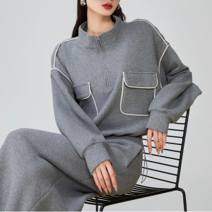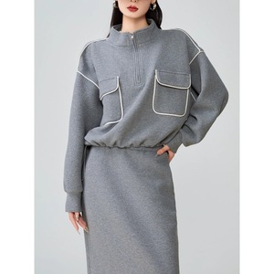 高级感灰色立领收腰卫衣半身裙休闲运动两件套装女2025春秋新款潮