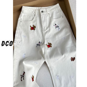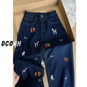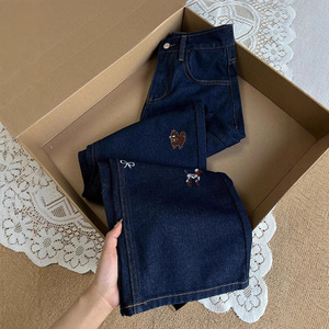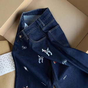 刺繍子犬蝶結びデザイン紺色ハイウエストストレートジーンズ