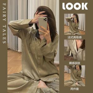 源工場 春秋用 アイスシルク ジャカード パジャマ レディース 長袖 長ズボン カーディガン 高級感 ホームウェア セット