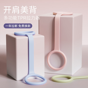 8字のラリーの女性は背中を開けてロープを引っ張ってフィットネスの弾力性を持って練習します。