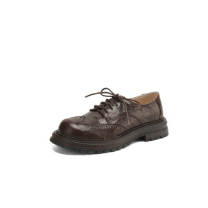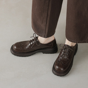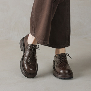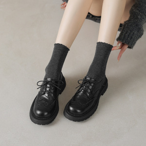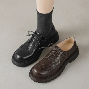 英倫風羊皮布ロックの小さい革靴2025春の太さの中と丸い頭の彫刻の本革のひもの深い口の靴の女性