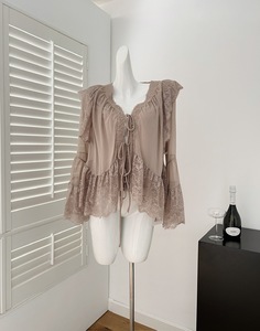2025年に再加工レースはvネックの蝶結びのラッパの袖のゆったりしたシャツの上着をつなぎ合わせます。