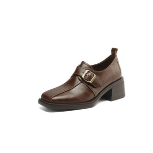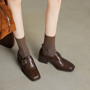 アメリカンアカデミー風 ~! レトロな四角い頭のベルトのバックルのマークの線の楽福の靴の太ヒールの中と黒い小さい革靴の女性 ~